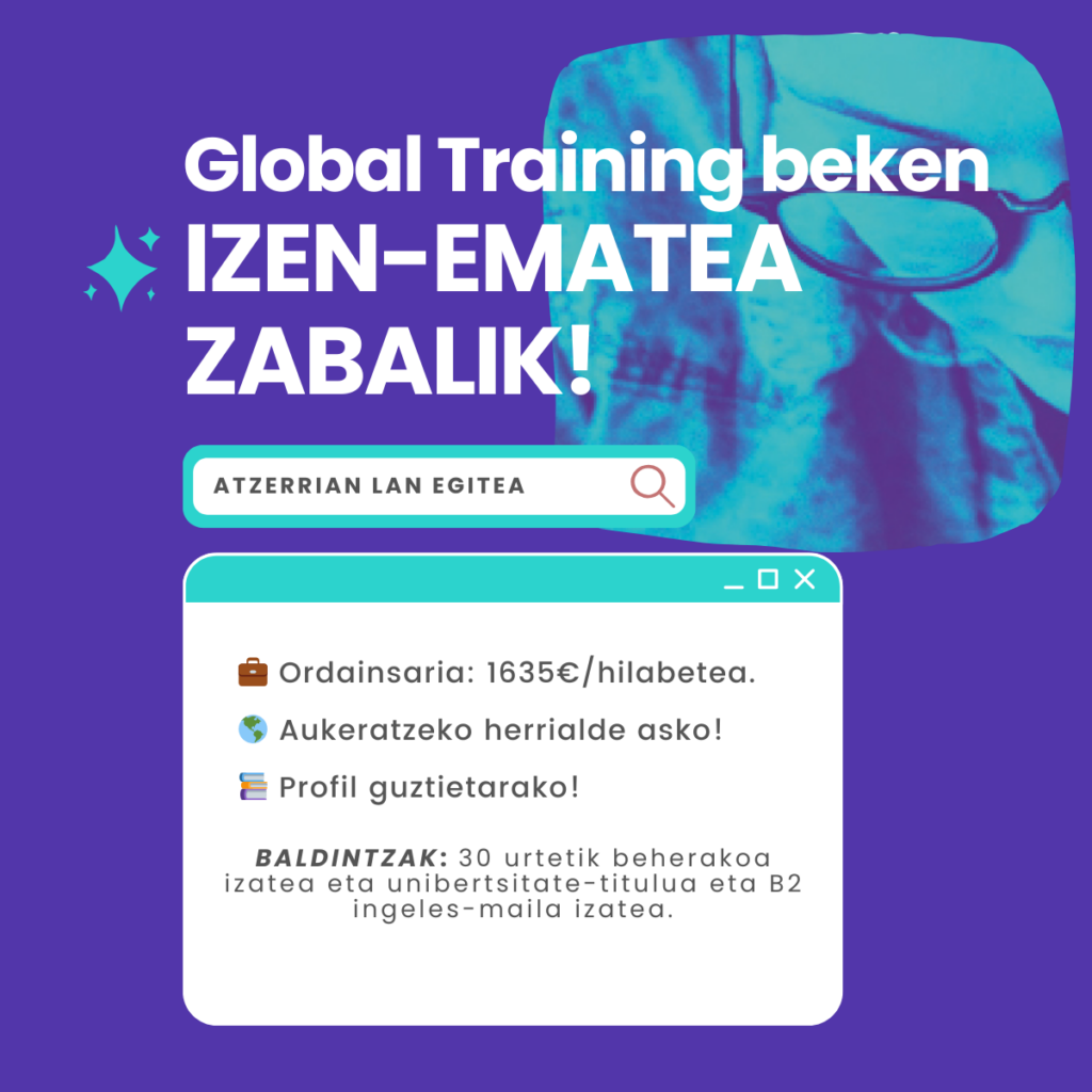 Izen-emateak hurrengo estekaren bidez egin daitezke, (https://becasglobaltraining.eus/) irailaren 13a baino lehen.